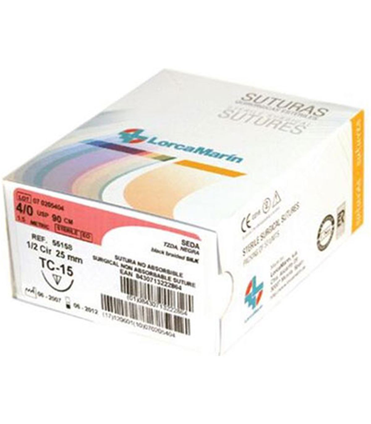 Sutura de seda no absorbible.Aguja 1/2 círculo triangular. TC - 15. 25 mm. Longitud de hebra 90 cm. EP 1,5. USP 4/0. 50 unidades.TIPO: Multifilamento trenzado con tratamiento anticapilar.COMPOSICIÓN: Fibras entrelazadas procedentes del capullo de gusano de seda siliconadas.COLOR: Negro.REACCIÓN TISULAR: Moderada.VIRTUDES: Gran resistencia a la tracción, alta flexibilidad y fácil realización y seguridad de los nudos.APLICACIONES: En la mayoría de los tejidos corporales como sutura o ligadura. Cirugía plástica y general. Sutura natural no absorbible.
