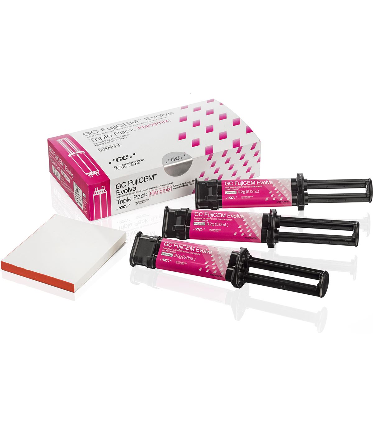 FujiCEM Evolve es un cemento de ionómero de vidrio modificado con resina que proporciona un rendimiento fiable y una agradable comodidad. Brinda facilidad de uso y rendimiento para trabajos protésicos estándar, desde restauraciones con base de metal retentivas hasta restauraciones de circonia. No es irritante ni presenta riesgo de sensibilidad postoperatoria. Mejora el rendimiento gracias a una excelente adherencia al diente y restauración, especialmente al zirconio. Disponible en color universal para adaptarse a todas las situaciones clínicas. Las puntas Push and Click se pueden poner y quitar fácilmente con un solo toque.CONTENIDO: FujiCEM Evolve Triple Pack de 3 jeringas x 92g y un Push and Click Tip Regular de 45 puntas de mezcla.