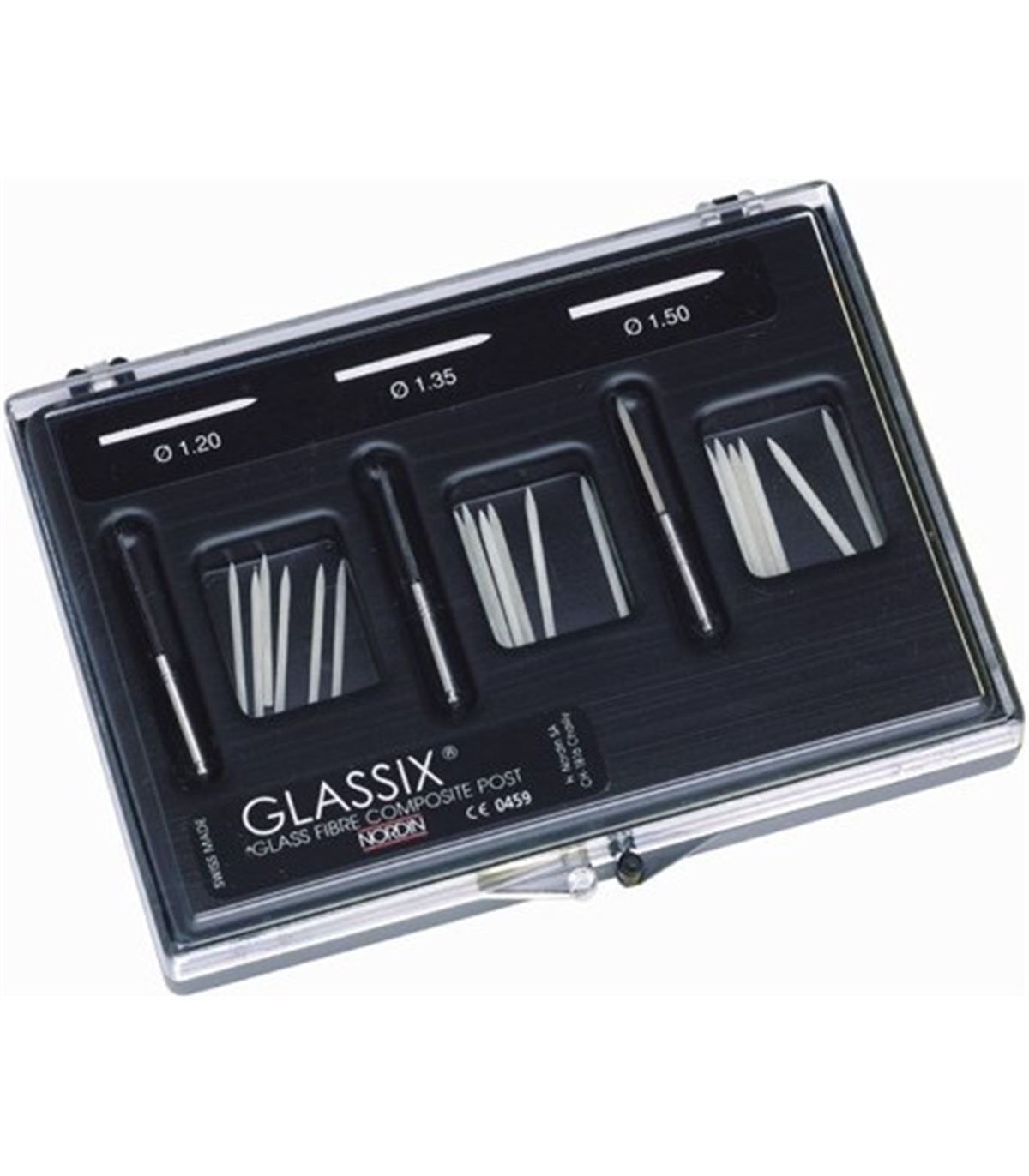 Postes de composite con fibra de vidrio. Su color blanco los integra en la restauración sin transparentar. Postes Glassix de Composite con Fibra de Vidrio: haces fuertes y elásticos de fibra de vidrio trenzada y aglomerada con composite. La fibra de vidrio previene la fractura del poste, haciéndolo muy elástico y, contrariamente a los postes metálicos, duros y rígidos, no trasmite tensiones y golpes a la dentina. Al contrario, actúa junto a esta absorbiendo cualquier tensión pues presenta aproximadamente la misma elasticidad. El composite establece una unión con un cemento-resina y el composite utilizado para la reconstrucción del muñón. La característica especial de Glassix es su color de diente estéticamente agradable que hace que al poste integrarse en la restauración de composite sin transparentar. Los postes están disponibles en tres diferentes diámetros, en forma cilíndrica con unas ligera conicidad en la punta, ideal para el conducto radicular y exactamente coincide con los taladros calibrados. Los postes Glassix son largos y fáciles de cortar para ajustar a la longitud necesaria. Se suministran en estuche con 18 unidades, 6 por cada medida, y 3 taladros o en cajas de 6 unidades de cada tamaño.