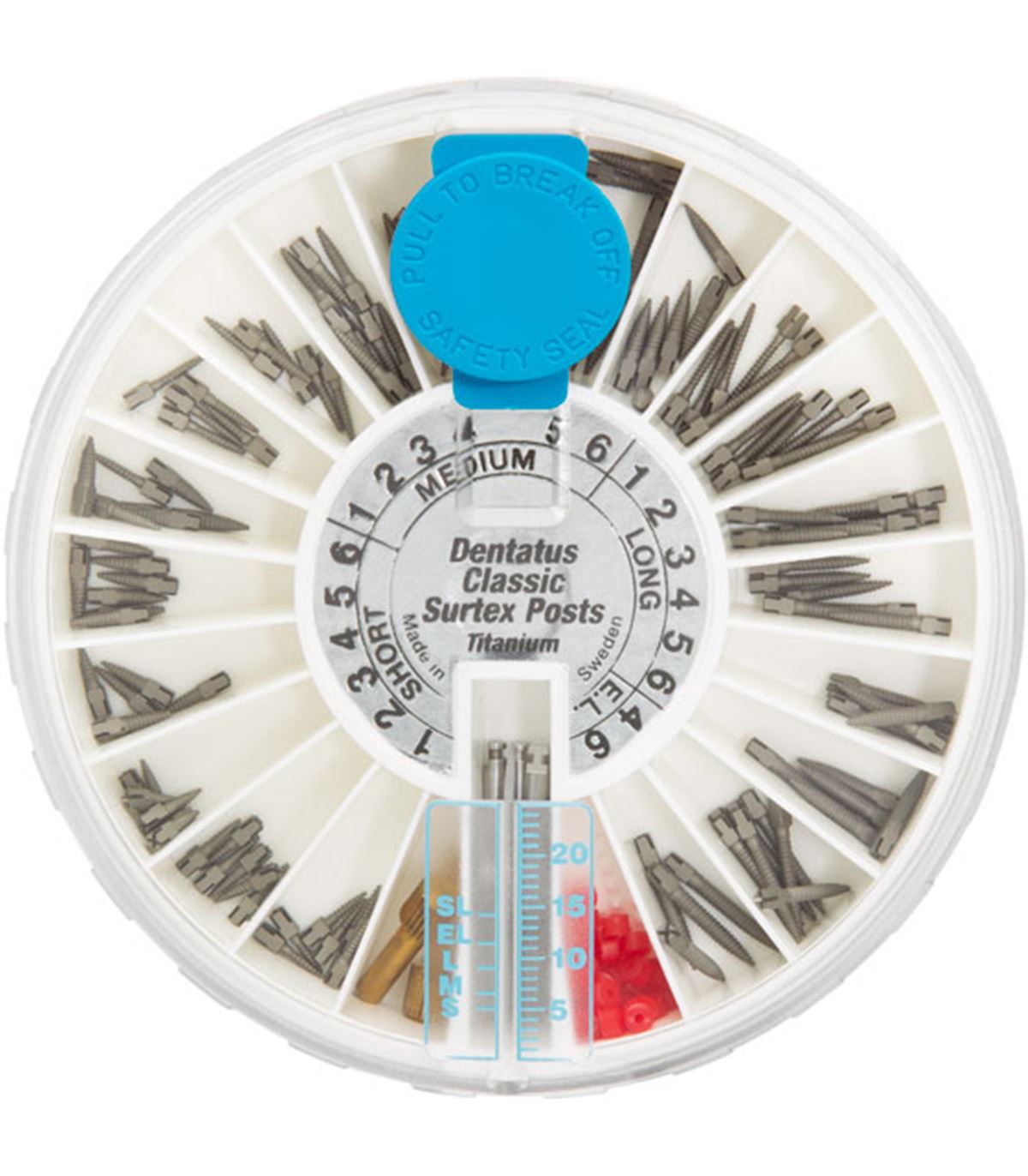 .Cilindro-Cónicos. Arenados 20 tamaños x 6u.Roscados o cementados. Tornillos Dentatus - Fabricados en titanio de 99 % de pureza. - Fuertes y compatibles con los tejidos. - Cabezal cuadrado con corte en cruz para mejorar la adaptación y retención de material. - Rosca central de retención pasiva que permite la salida del cemento sobrante. - Diseño anatómico que se adapta perfectamente a la forma de la raíz. - La técnica exige el uso del ensanchador correspondiente al número de tornillo a colocar. - Las reconstrucciones pueden efectuarse con compuestos y/o amalgamas
